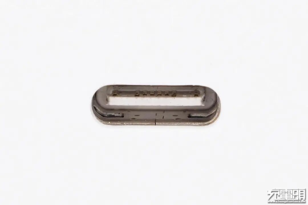 小米65W氮化镓充电器采用USB-C接口,白色胶芯,每一个侧面设有8根触点。