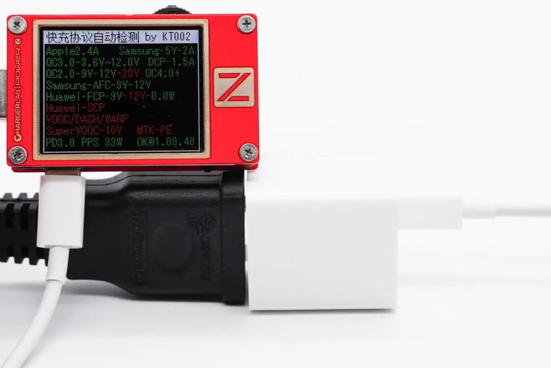 使用ChargerLAB POWER-Z KT002测得小米33W氮化镓充电器支持Apple 2.4A、Samsung 5V2A和DCP协议,以及QC2.0/3.0、AFC、FCP、PD3.0、PPS快充协议。