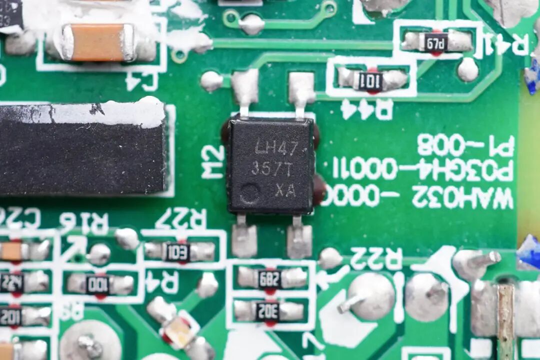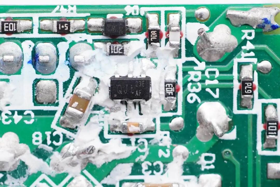 PCB板背面一览,初次级隔离区域贴有胶垫,旁边有一颗光耦。初级侧采用四颗二极管整流。