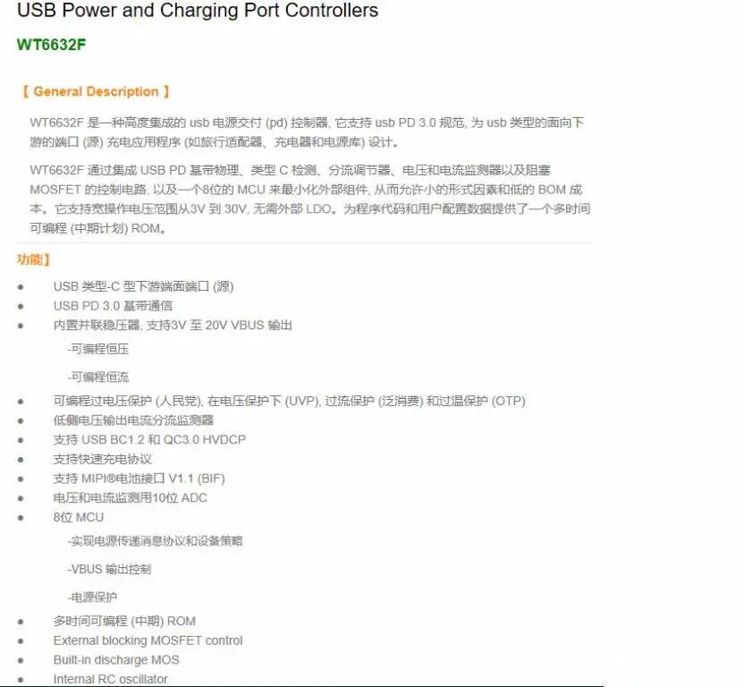 USB PD协议IC采用Weltrend伟诠WT6632F,这款芯片已经通过了USB PD3.0认证。作为一款高度集成的USB PD控制器,它支持USB PD3.0 规范,支持宽操作电压范围从3V到30V,为USB类型的面向下游的端口 (源) 充电应用程序 (如旅行适配器、充电器和电源库) 设计。
