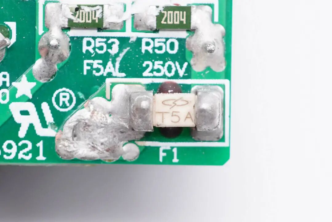 贴片保险丝设在主板背面,额定电流5A。