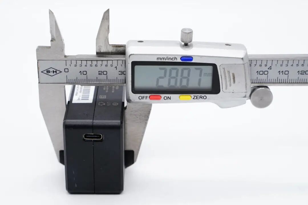 使用游标卡尺实测充电器机身长度为58.86mm。