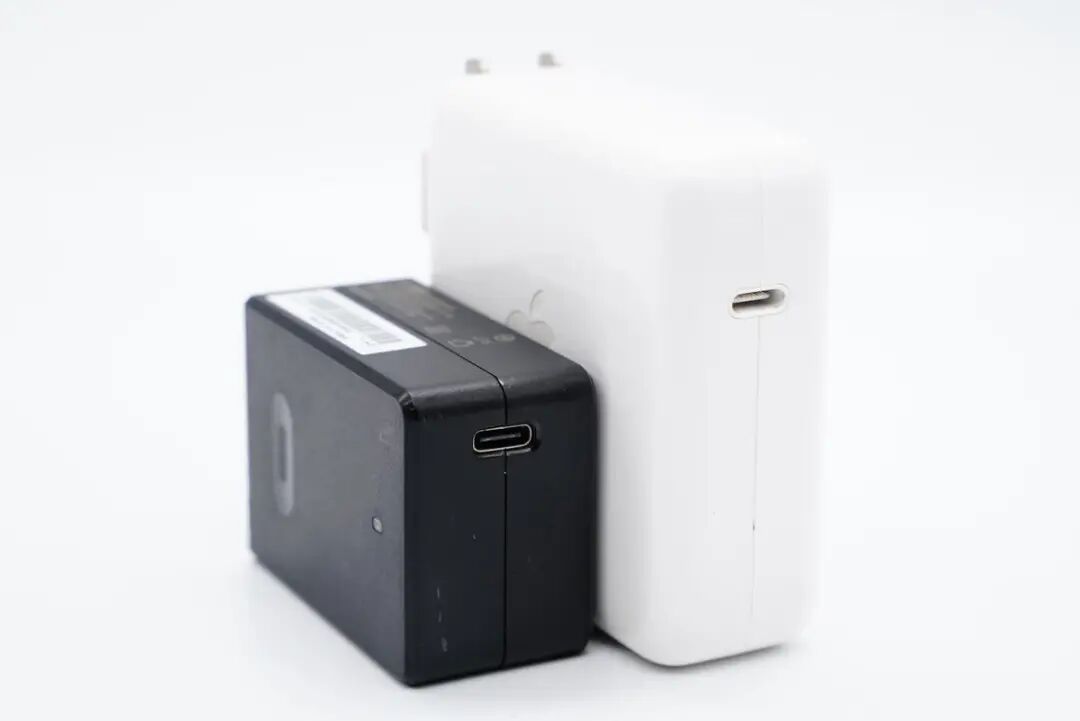 和苹果61W充电器直观对比,体积优势非常明显。