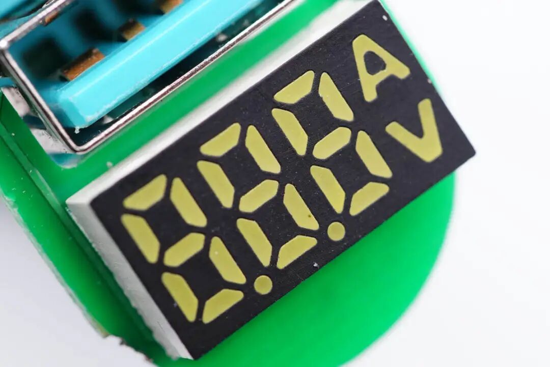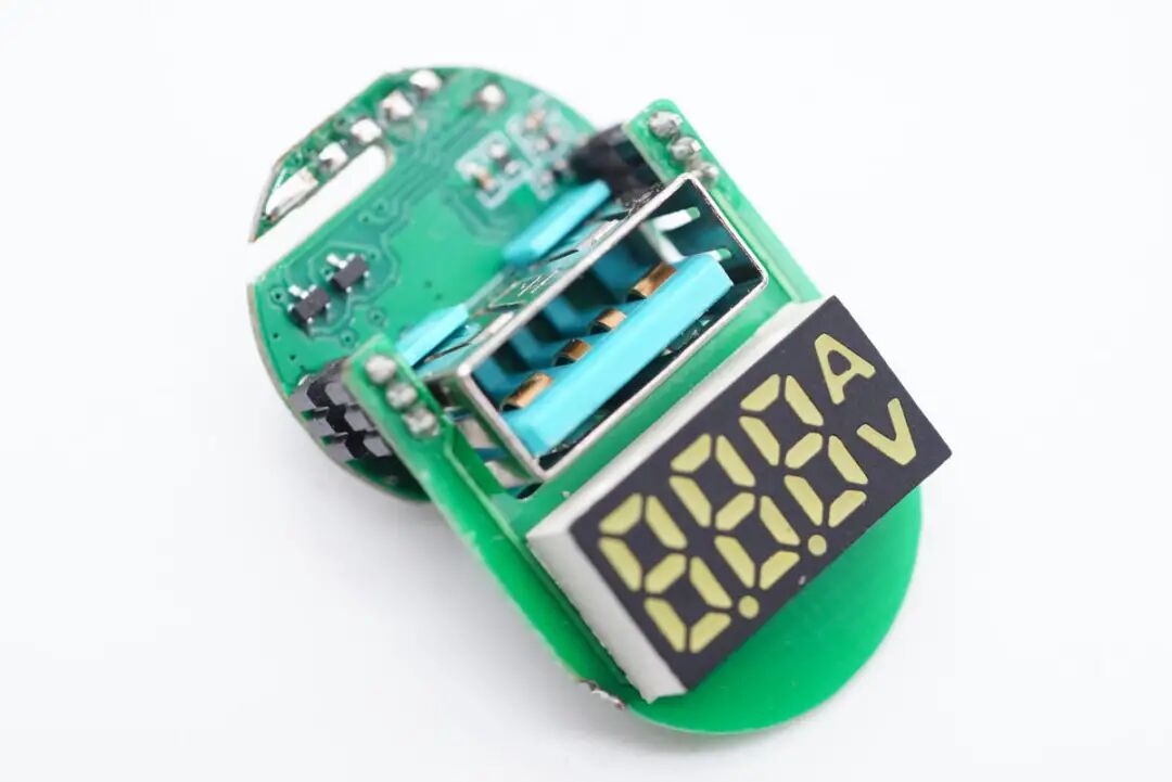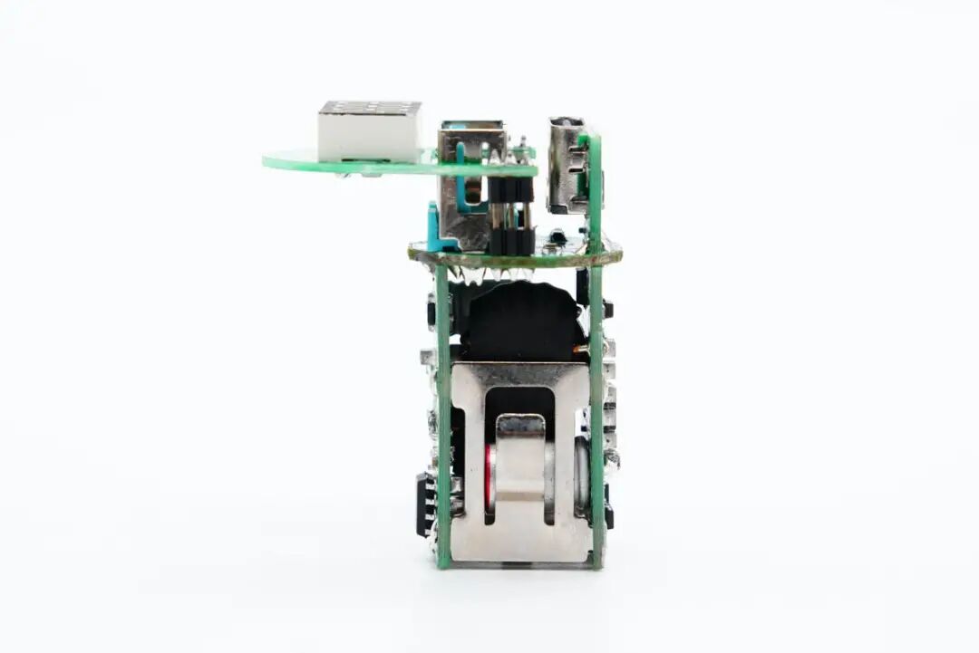 车充内设4块PCB小板,其中两侧长条小板采用负极金属片和圆形小板连接,LED显示屏所在小板使用排针焊接在圆形小板上。