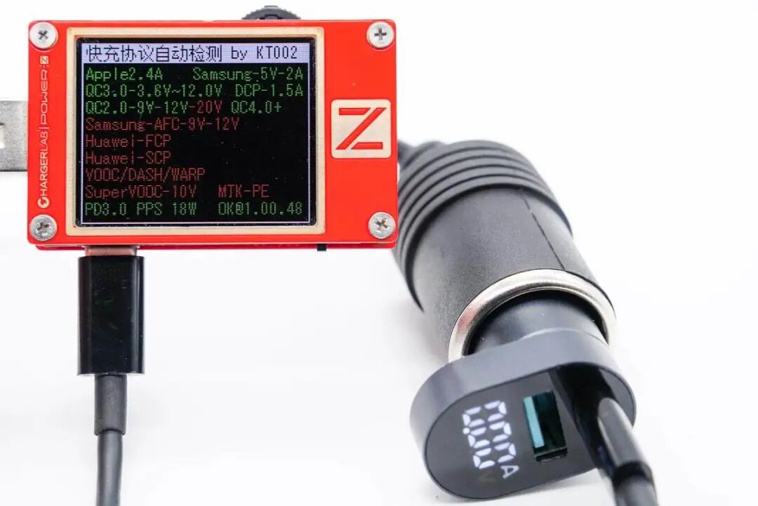 使用ChargerLAB POWER-Z KT002测得USB-A口支持Apple 2.4A、Samsung 5V2A、DCP协议,以及QC2.0/3.0、FCP、SCP快充协议。