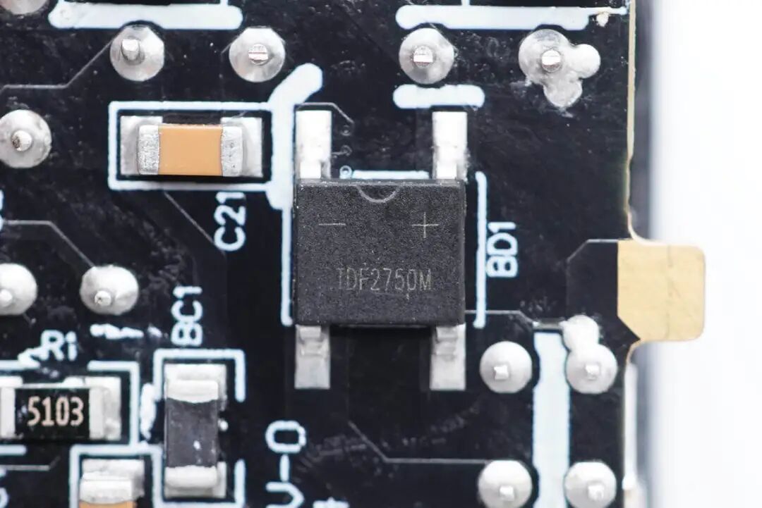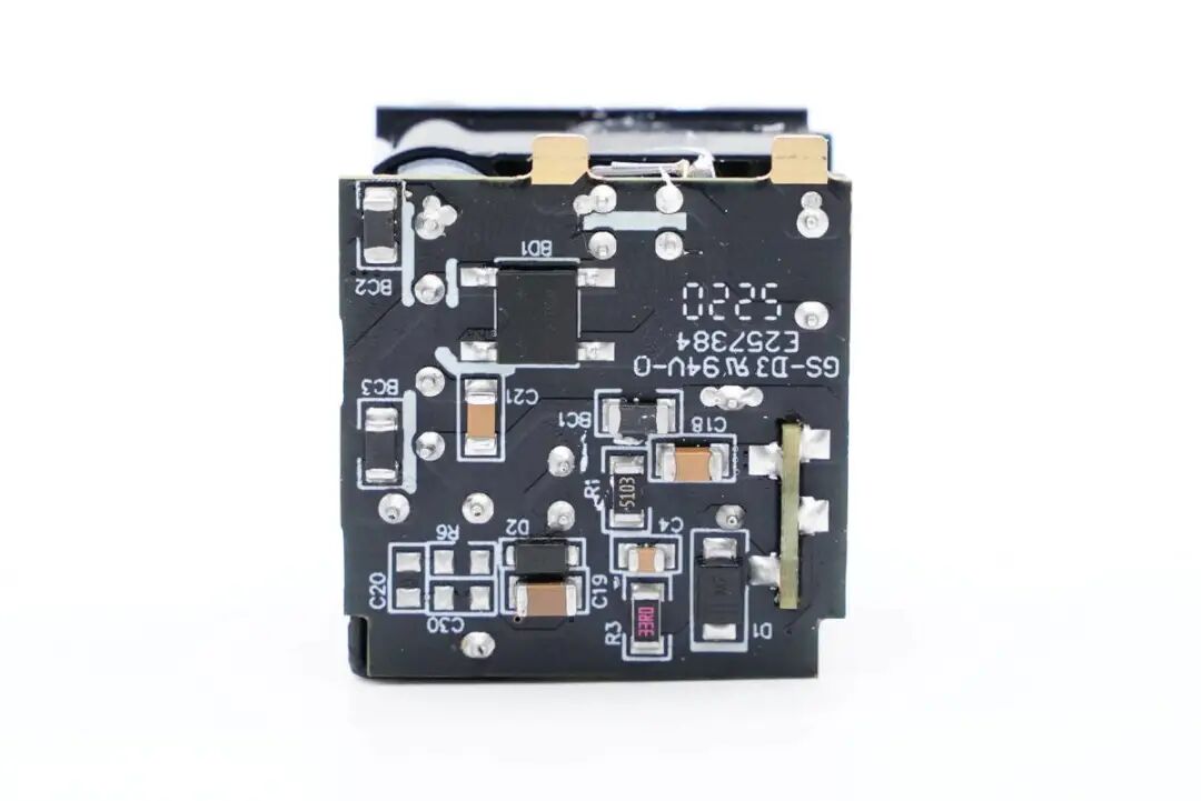 通过观察发现,这款充电器采用时下热门的多块PCB板组合焊接设计方案,并且采用典型的反激开关电源宽范围输出,由协议芯片控制输出电压的架构。下面我们就从输入端开始一一了解各元器件。