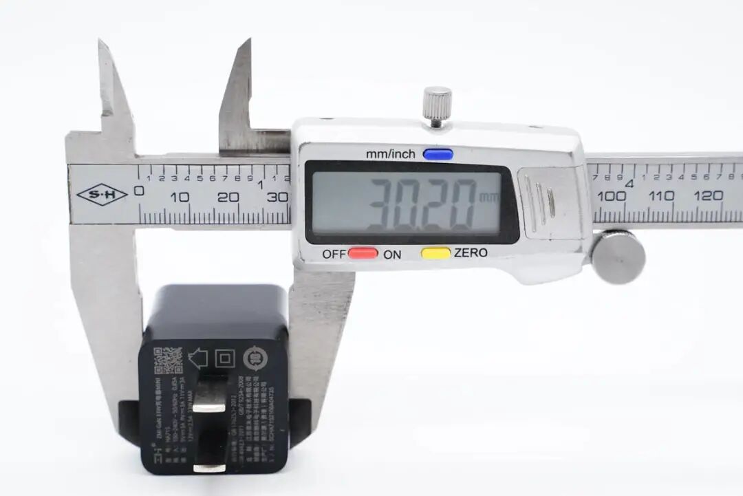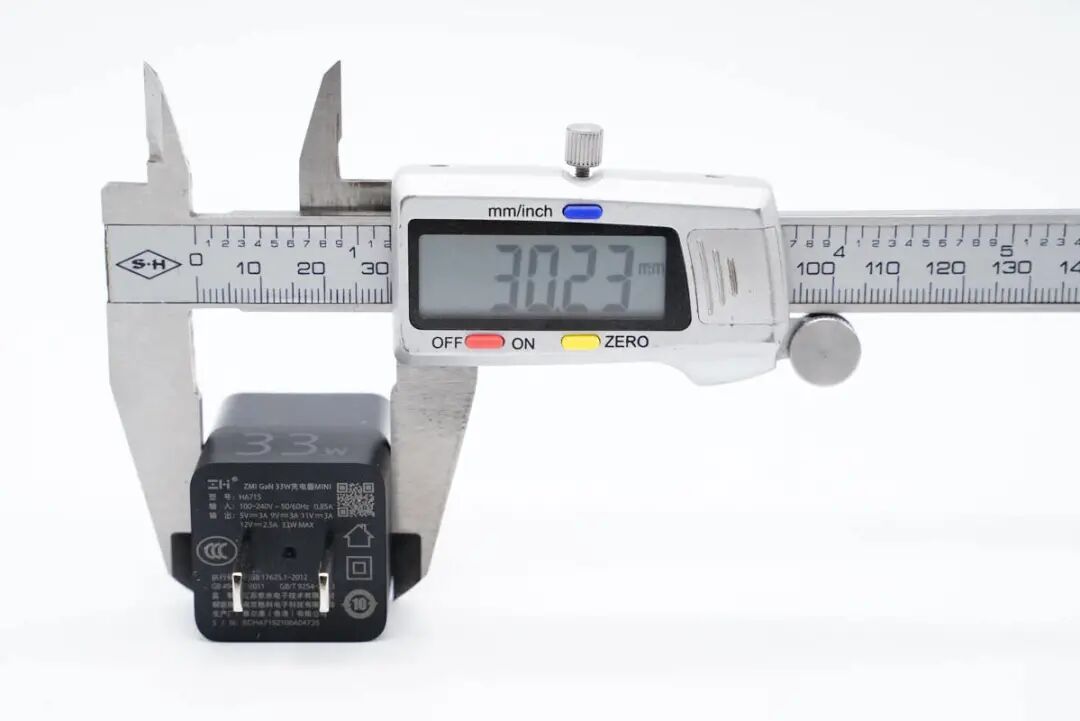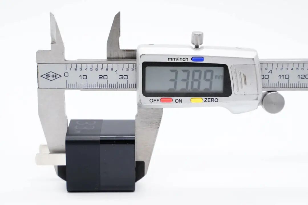 使用游标卡尺实测充电器机身高度为33.89mm。