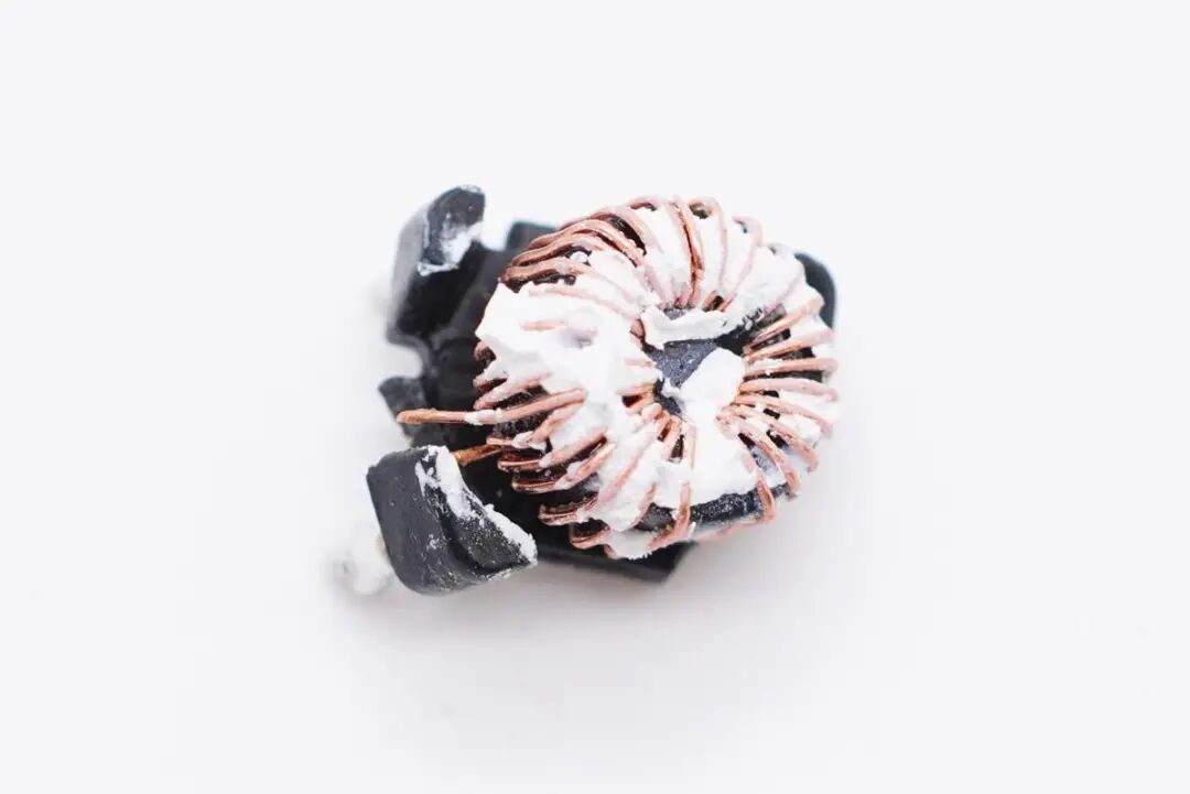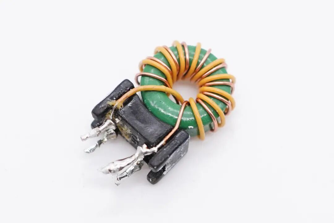 共模电感双线绕制,并有塑料底座支撑,用于滤除EMI干扰。
