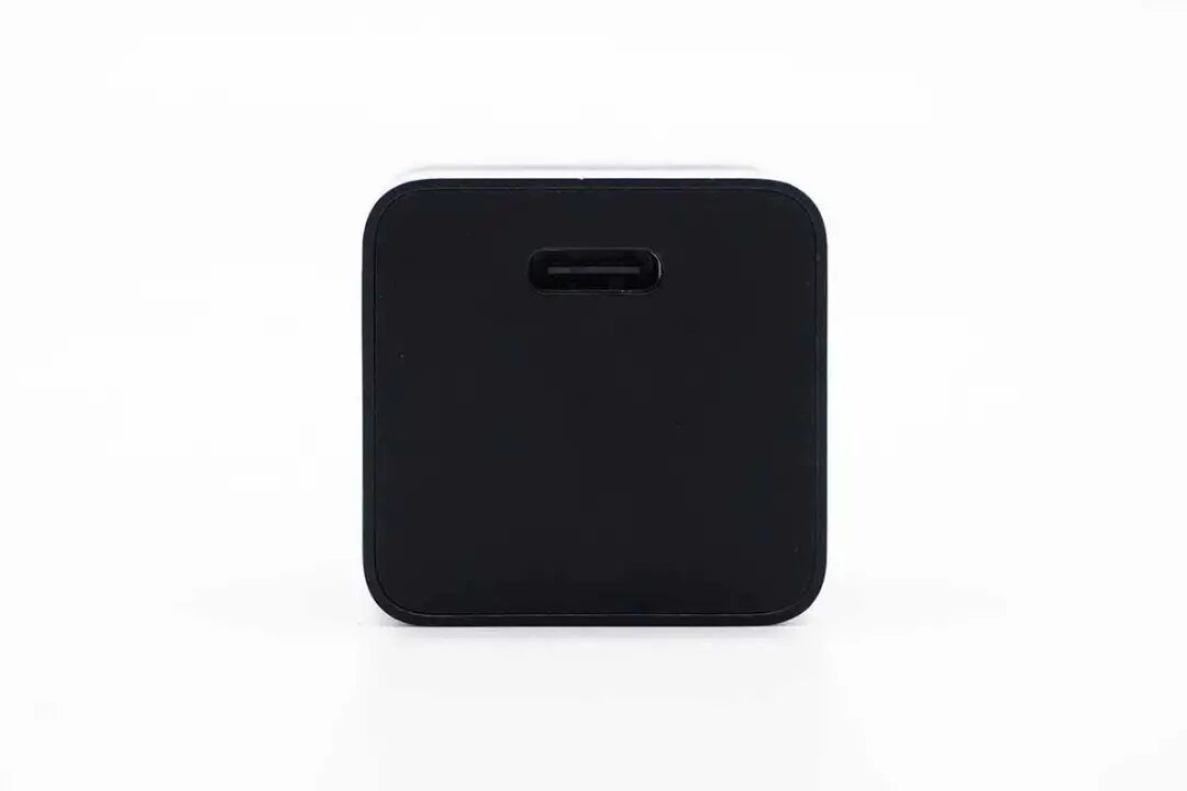 充电器采用PC阻燃材质黑色外壳,方块造型设计,上下端切面且边缘棱边分明。