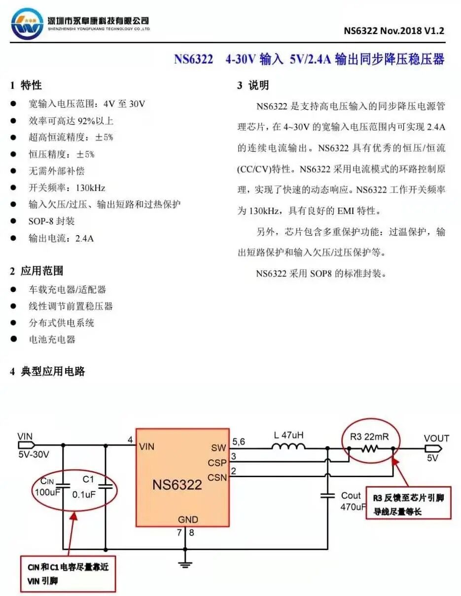 永阜康NS6322同步降压稳压器,为USB-A口降压5V输出。