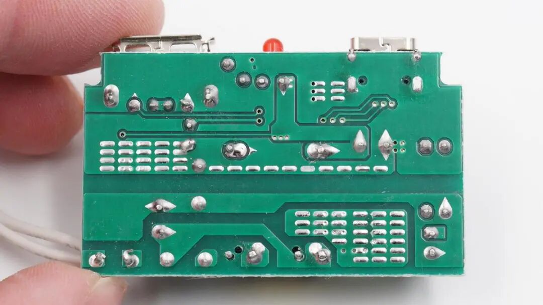 输出端一览,两个USB母座过孔焊接,中间有工字电感和指示灯。