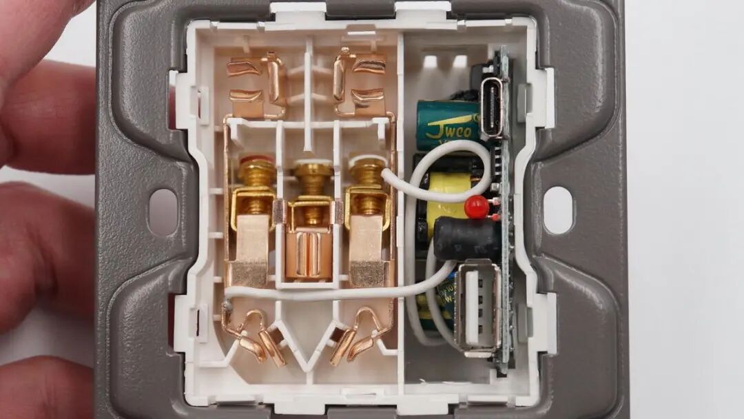 插座内设AC插孔和充电器模块槽位,之间有隔离板隔离,并通过白色导线连接通电。