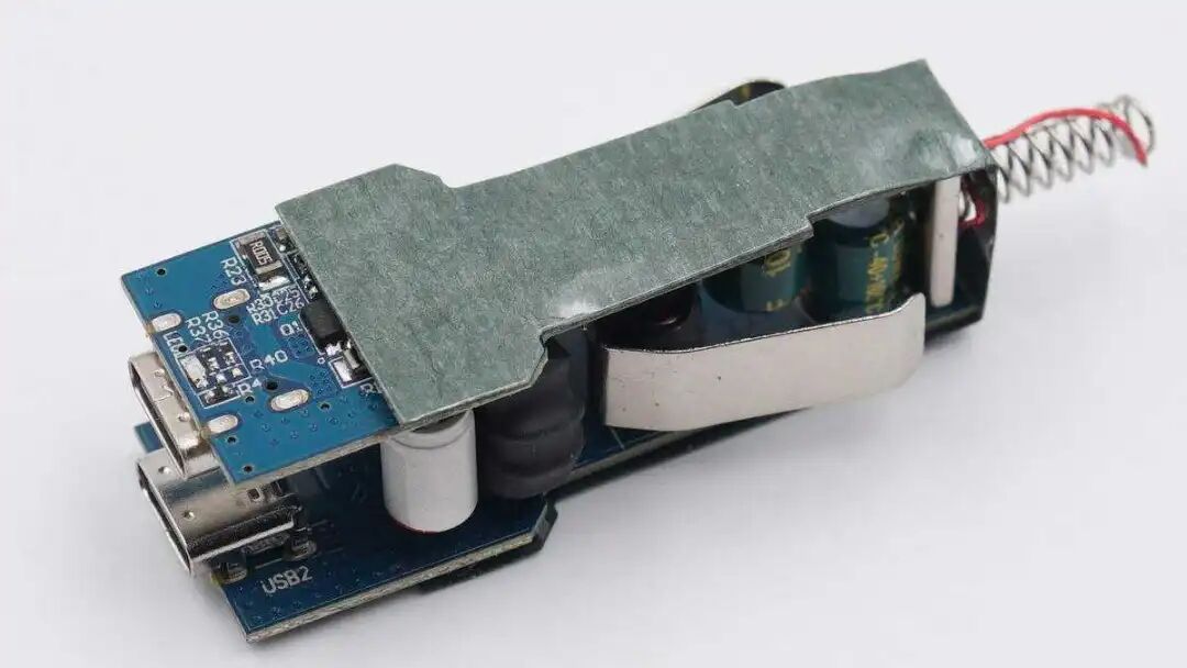 内部采用两块PCB小板设计,之间有金属片支撑。