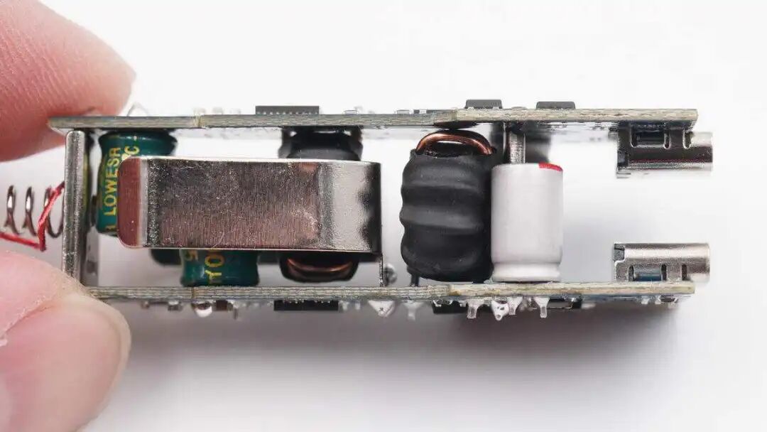 从侧面可以看到输入输出滤波电容、降压电感也是每个板子各设一颗,电感外套热缩管保护。