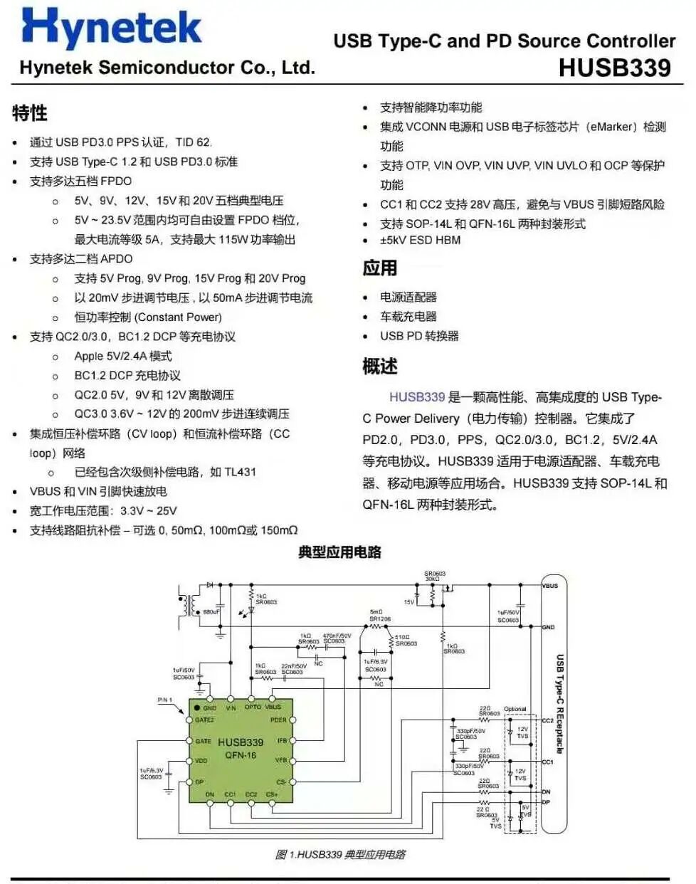 协议芯片采用慧能泰HUSB339,这款芯片已经通过了USB PD3.0认证,TID 62。HUSB339是一颗高性能、高集成的USB Type-C Power Delivery(电力传输)控制器,集成了PD2.0、PD3.0、PPS、QC2.0/3.0、BC1.2、5V2.4A等充电协议;适用于电源适配器、车载充电器、移动电源等应用场合;拥有SOP-14L和QFN-16L两种封装模式。