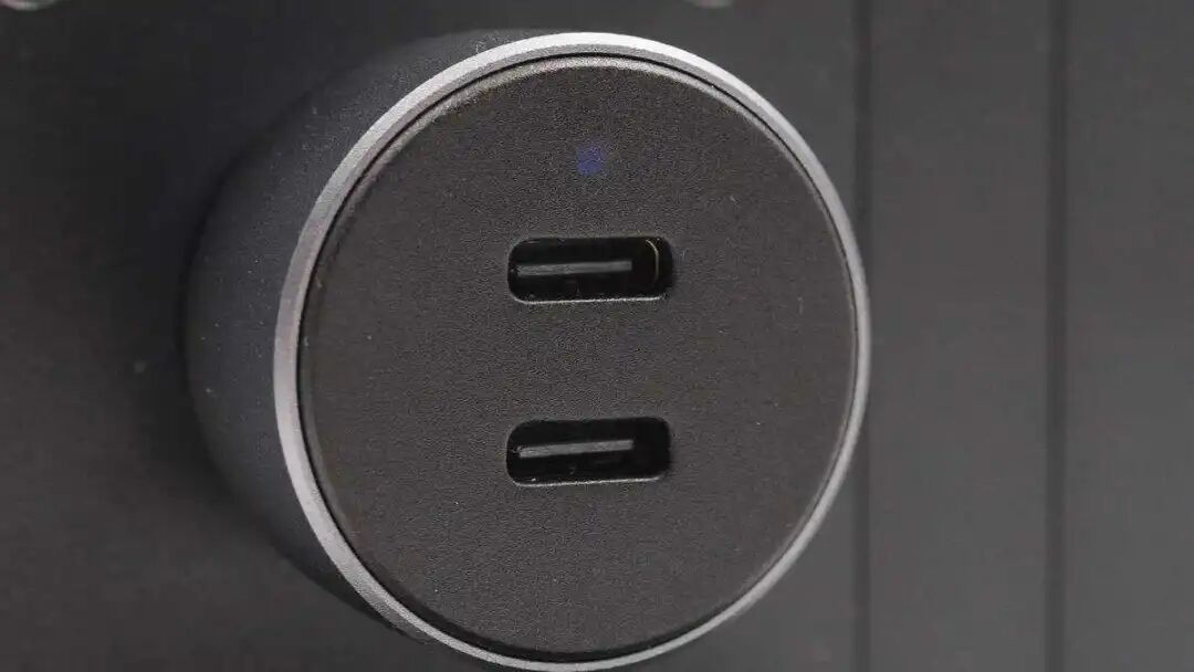 输出端配有LED指示灯和双USB-C口,接口黑色胶芯不露铜,接通电源指示灯亮蓝光。
