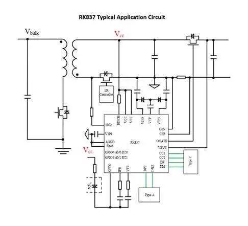 图为RK837应用电路,支持1A1C输出,采用QFN4*4-24封装