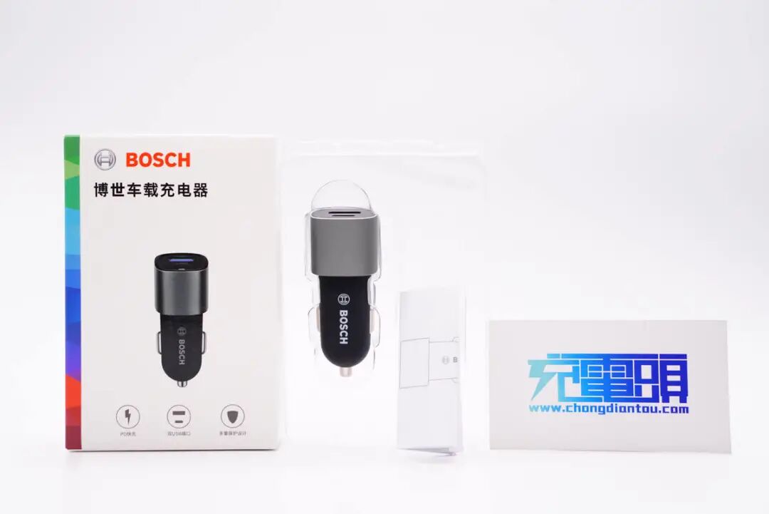 最近充电头网拿到了BOSCH博世一款车载充电器,产品小巧精致,配备1A1C双快充接口,其中USB-A口支持45W快充,USB-C口支持30W PD快充,双口同时输出,最大功率25W,功率智能分配。下面就对这款车充进行详细拆解,看看设计做工如何。