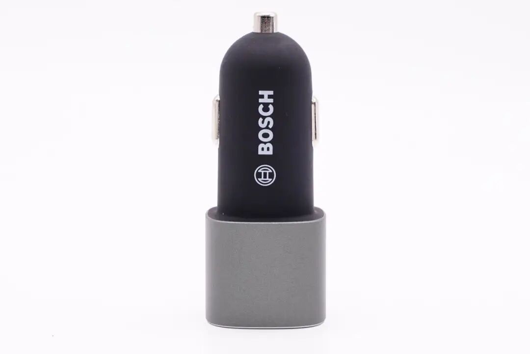 车充采用PC阻燃材质黑色外壳,表面光滑且具有类肤手感,正面印有BOSCH品牌logo。机身头部还套有一个灰色金属壳,表面喷砂处理。