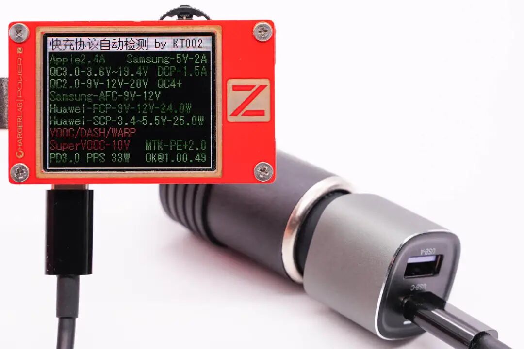 使用ChargerLAB POWER-Z KT002测得USB-A口支持Apple 2.4A、Samsung 5V2A、DCP协议,以及QC2.0/3.0、AFC、FCP、SCP快充协议。