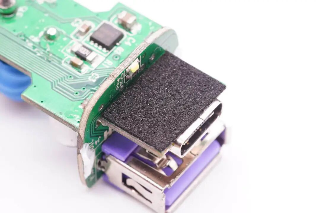 USB-C母座特写,使用小板垂直焊接,沉板设计。