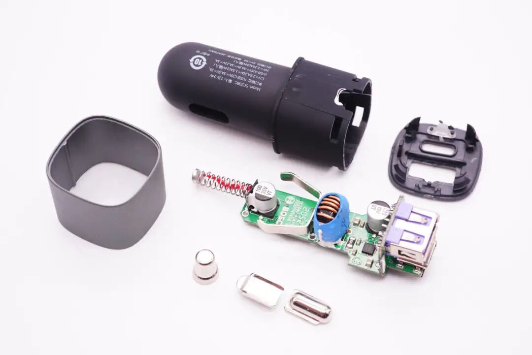 车充顶部塑料壳采用卡扣进行固定封装。