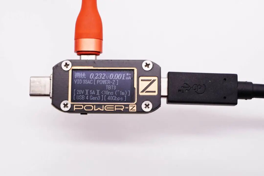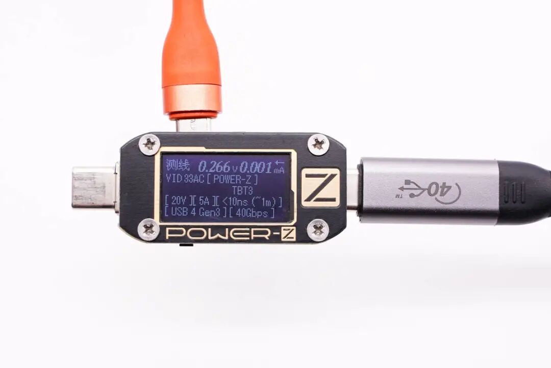 使用ChargerLAB POWER-Z KM001C检测,显示该线缆带有E-Marker芯片,电力传输能力为20V5A,数据传输能力为USB 4 Gen3,最大传输速度可达40Gbps。