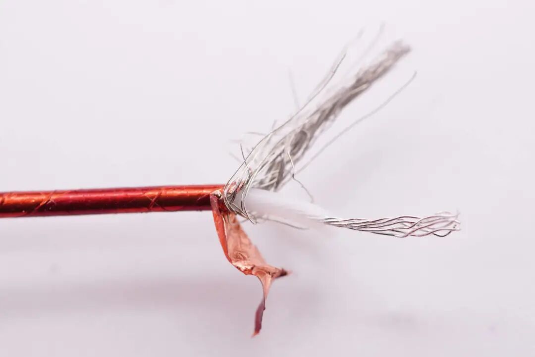 红色粗线芯特写。塑料外皮里面是一层铜箔和金属屏蔽网,最里面的传输线芯使用白色塑料皮包裹绝缘。