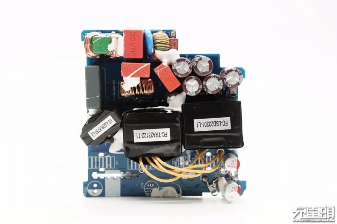 PCB板上元器件布局紧凑有序,初次级之间设有塑料隔离板,正背面设有大面积黄铜散热片,保证高功率充电状态下的散热性能。此外输入端采用昱光电解电容进行滤波,输出端设有二次滤波固态电容进行滤波,输出纯净。