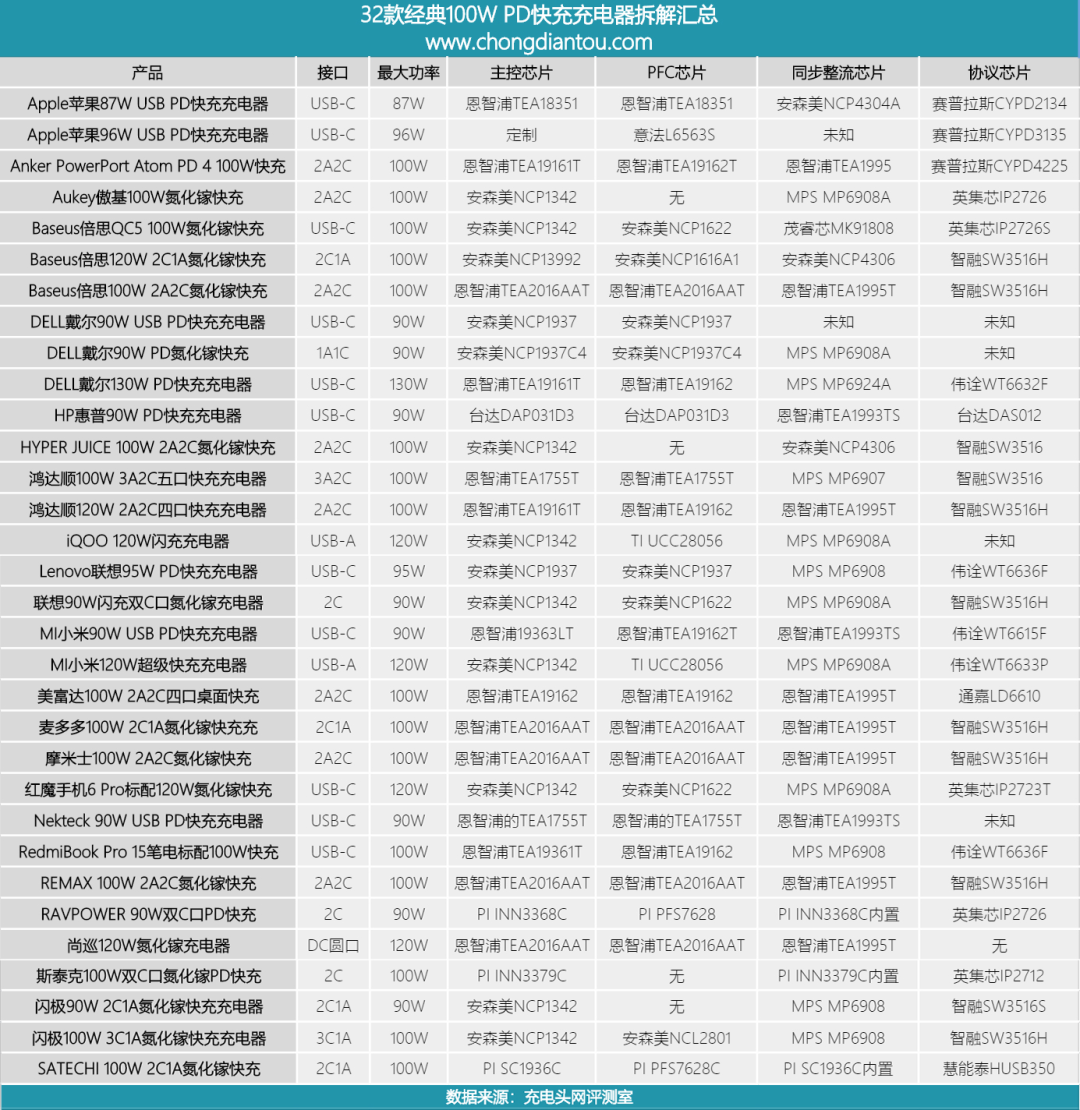 诸如苹果、小米、戴尔等品牌的大功率快充,更像是专属“神器”,为自家产品充电才会有很好的快充体验。充电头网通过对以上32款100W级别PD快充充电器拆解了解到,手机、电脑厂商推出的单口快充和电商推出的多口快充占比上旗鼓相当,因此都不能小瞧了某一方。