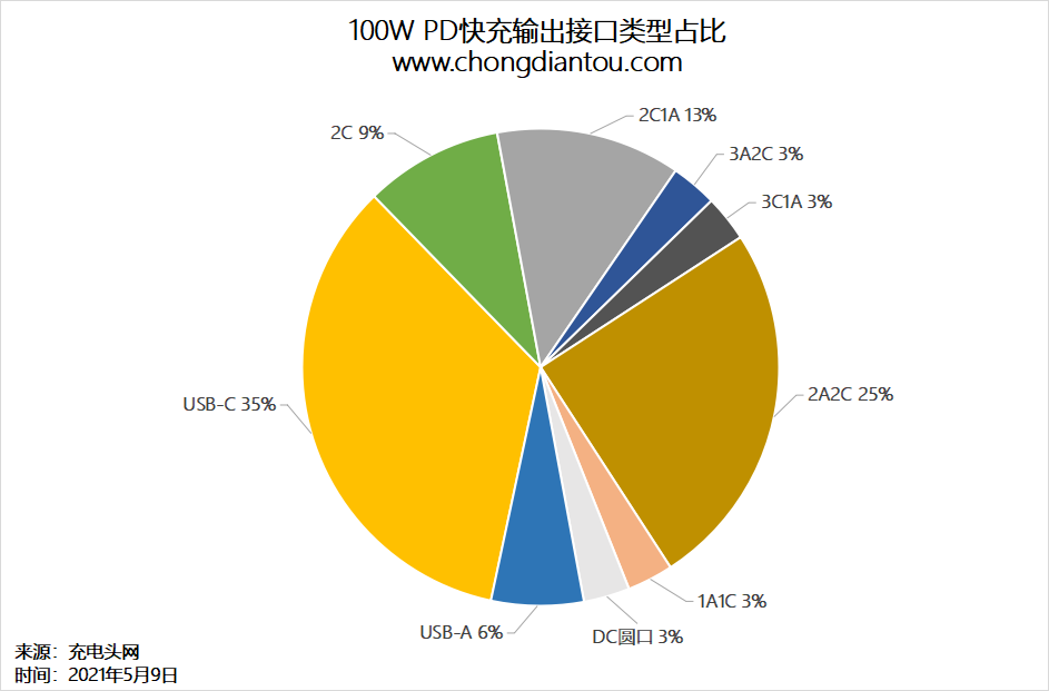 在输出接口方面,30余款100W级快充中,USB-C单口产品占比最高,达到35%。据了解,这些单口大功率快充基本都由笔电厂商推出,包括苹果、惠普、戴尔、联想等知名品牌。由此可见,目前笔记本电脑市场对百瓦大功率快充的需求最为强烈。