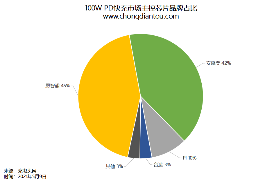 主控芯片方面,这么多100W级快充中,恩智浦和安森美分别以45%和42%的市场占比分庭抗礼,同时这两家加起来又占据了主控芯片市场的近九成份额。