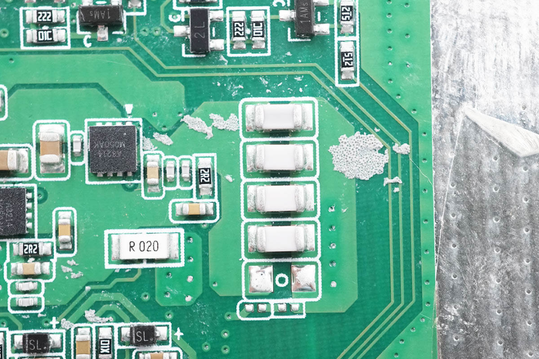R020电流检测电阻和四颗并联的NPO谐振电容,对应三组无线充电输出。