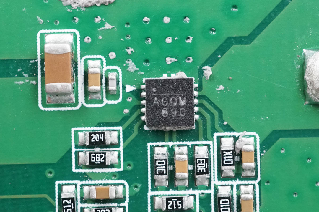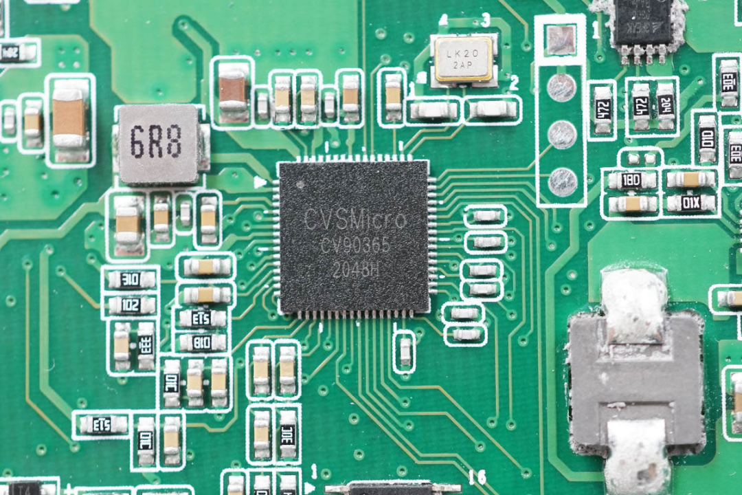 电路板镂空焊接降压电感,降低厚度。降压电感采用合金电感。据悉,这几颗电感由东莞市三体微电子技术有限公司提供。