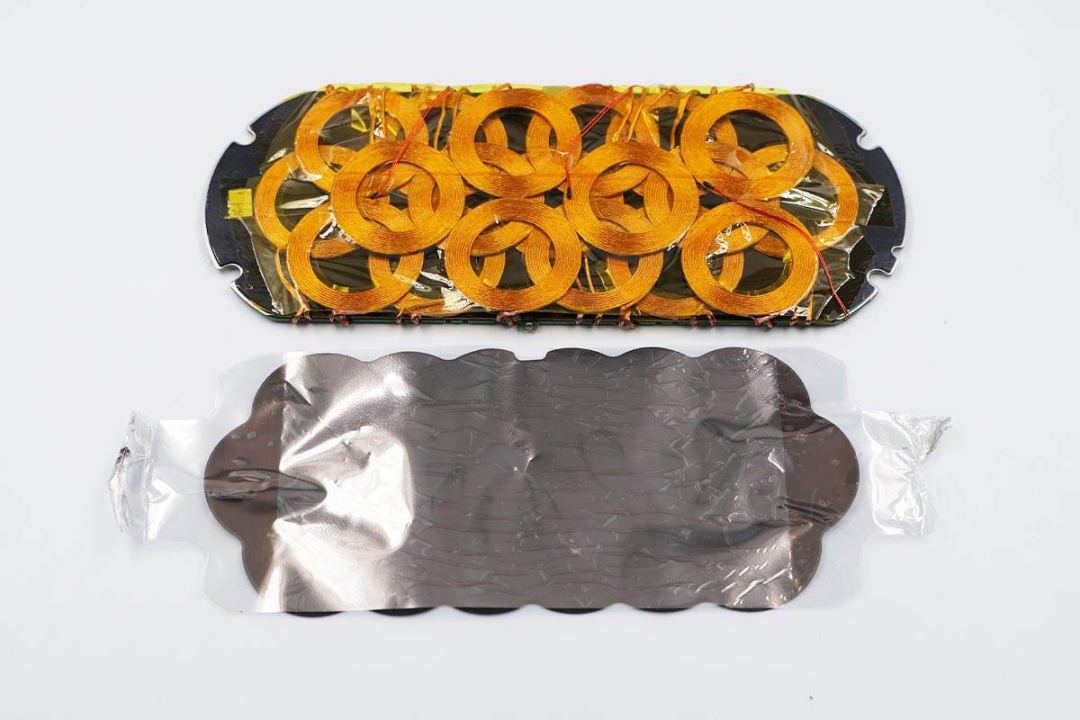 无线充电线圈分成三层,六个三角形排列。底层7个线圈,顶层和中间层各6个线圈。