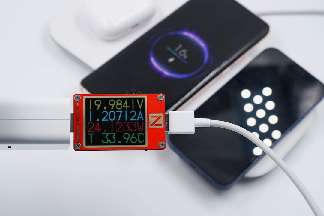将小米10、苹果iPhone 12以及AirPods Pro三款产品同时放到充电板上,此时测得输入功率为19.98V 1.21A 24.12W。