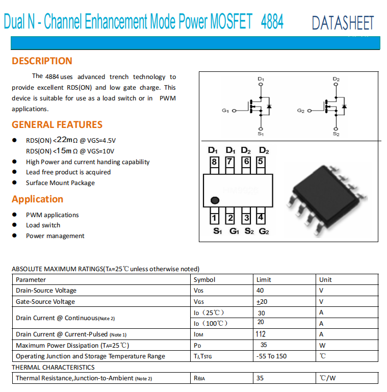 诚芯微4884,双NMOS管,耐压40V,用于输出同步整流降压。