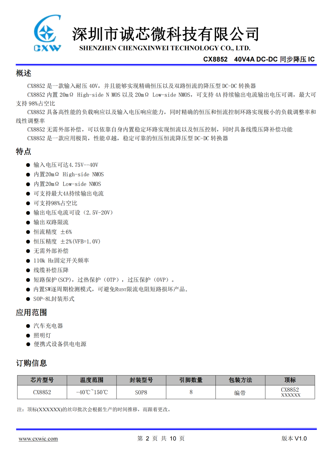 CX8852具备高性能的负载响应以及输出电压响应能力,同时精确的恒压和恒流控制环路实现极小的负载调整率和线性调整率。无需外部补偿,同时具备线缆压降补偿功能。这是一款应用极简,性能卓越,且稳定可靠的恒压恒流降压型DC-DC转换器。