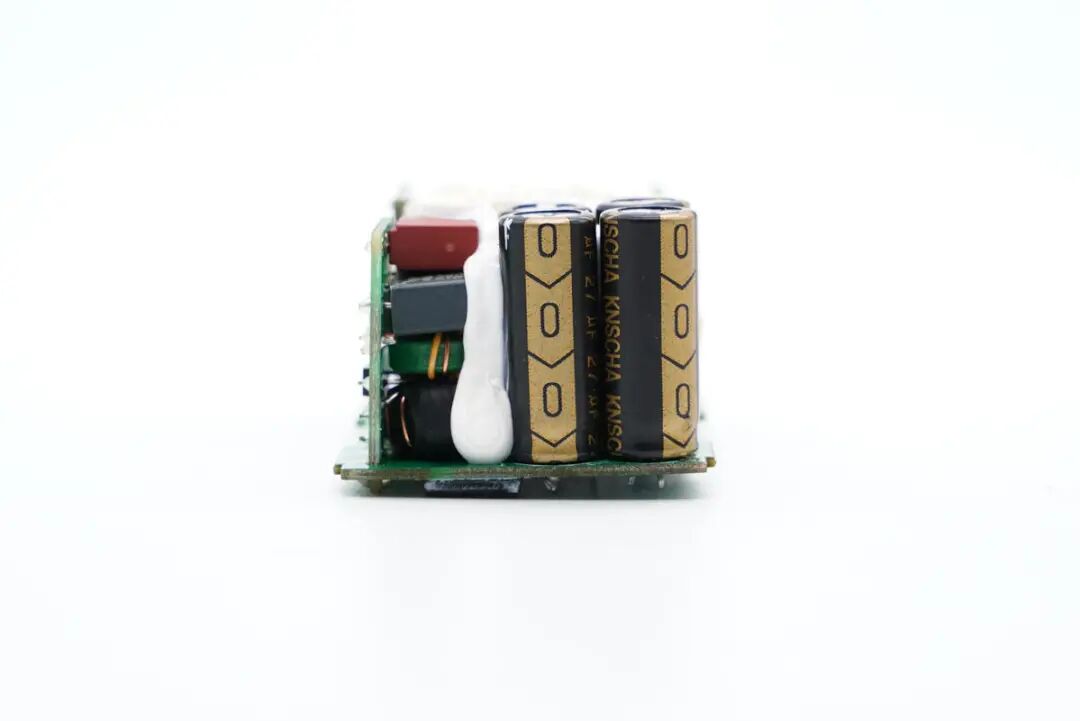 PCB板正面一览,经典的三段式布局设计,变压器、电容等打胶加固,输出端母座均焊接在小板上。