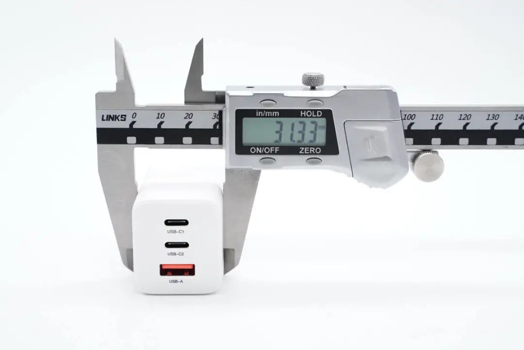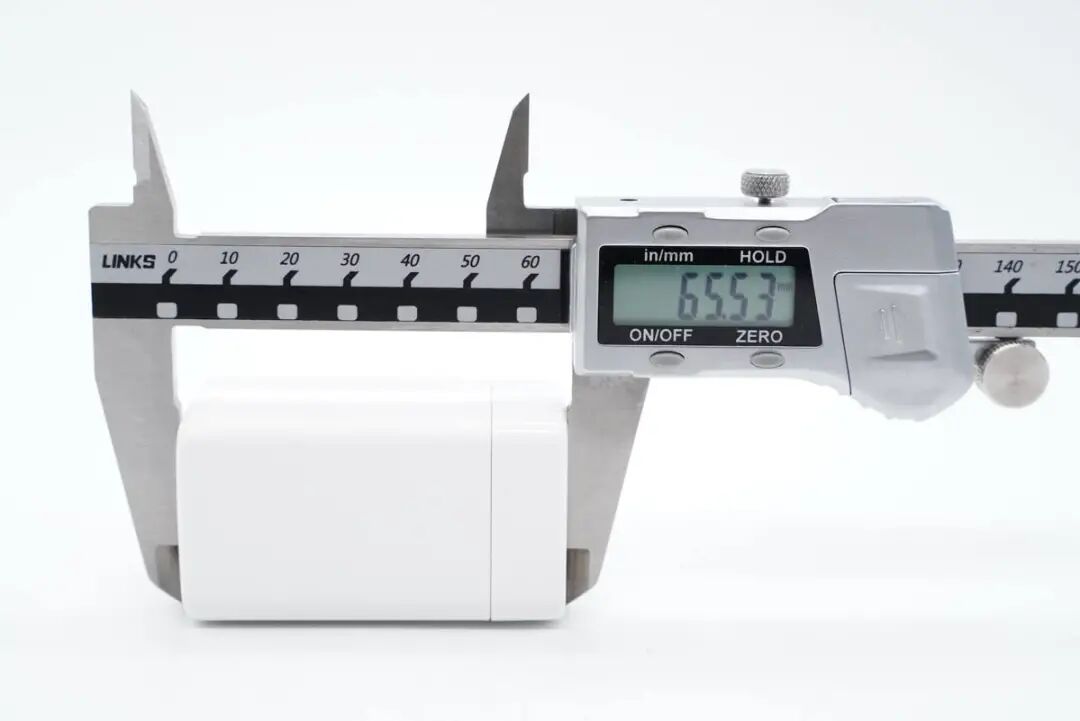 使用游标卡尺实测充电器机身长度为65.53mm。