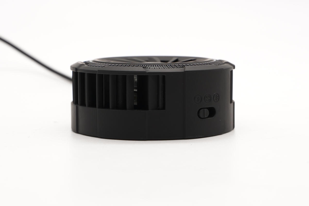 邦克仕这款制冷无线充造型很像一块小月饼,PC材质塑料外壳,表面哑光具有类肤手感,顶部设有银灰色装饰环,边缘有类似卡扣的凸起,科技风格设计。