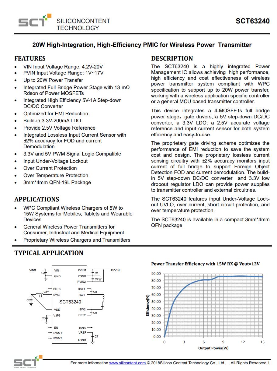 芯洲科技 SCT63240 无线充电全桥功率级,用于线圈驱动,支持20W输出功率,内置5V1A开关降压和3.3V稳压,并提供2.5V电压基准。