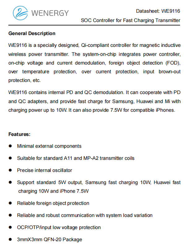 微鹅WE9116无线充电主控IC,外围元件精简,适配A11线圈,支持5W、7.5W、10W输出。