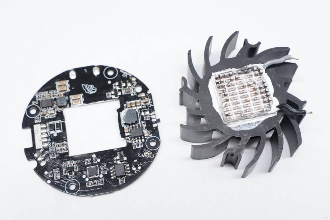 PCB板中心镂空以穿过制冷晶片,制冷晶片热端粘在散热风扇上,冷端为无线充部分降温。