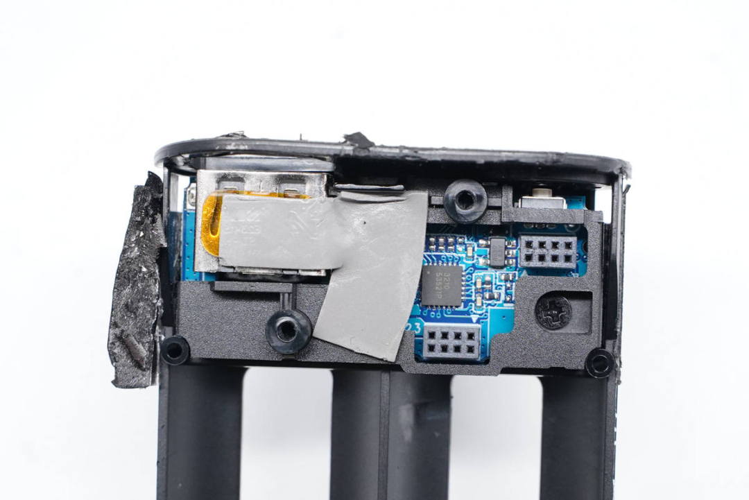 内部框架的一侧为镂空设计,可见两颗21700圆柱电芯,中间用导热胶固定了一颗热敏电阻,用于电池的温度监测。