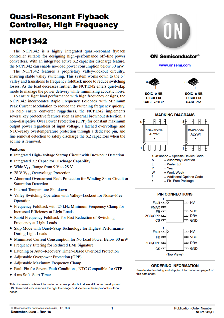 开关电源主控芯片采用ON安森美NCP1342,这是一颗高频准谐振反激初级PWM控制器,内置主动X2电容放电和多重完善的保护功能,具有超低的待机功耗.,用于驱动英诺赛科氮化镓开关管。