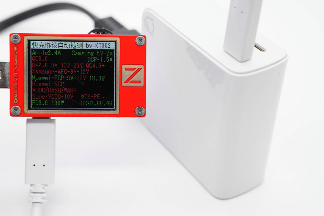 使用ChargerLAB POWER-Z KT002测得USB-C1口支持Apple 2.4A、Samsung 5V2A、DCP协议,以及FCP、PD3.0快充协议。