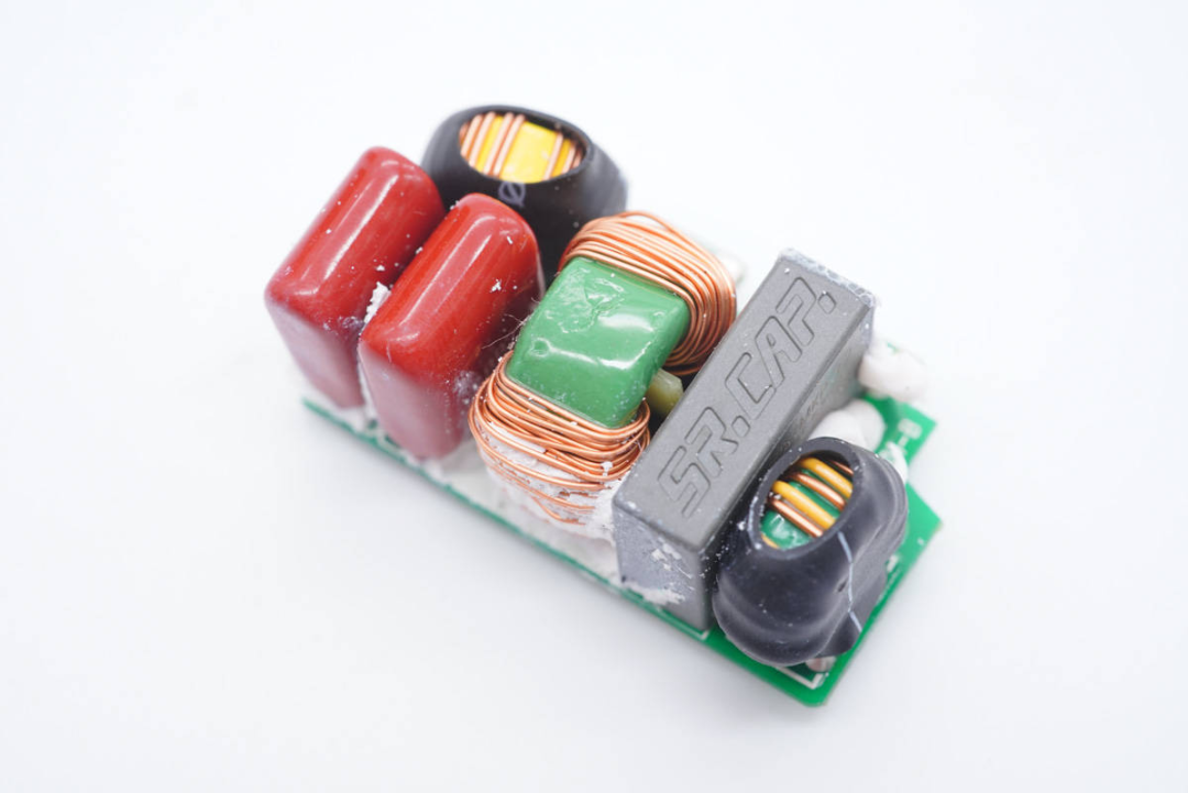 正面有两级共模电感、安规X电容、薄膜滤波电容以及滤波电感,小的共模电感以及滤波电感外套热缩管保护。