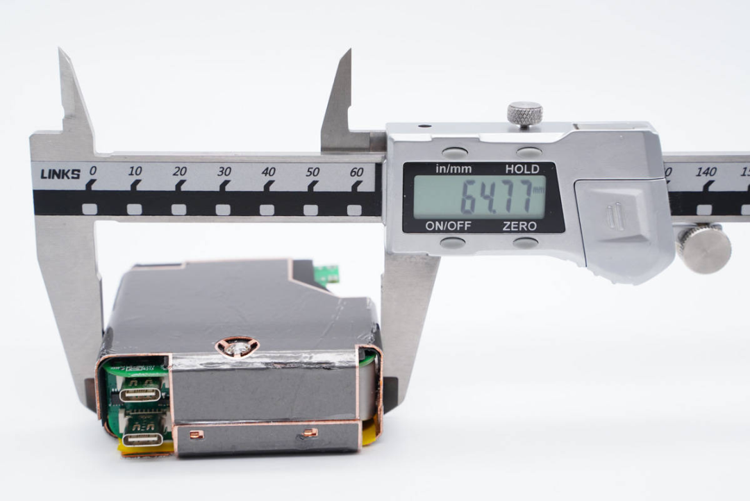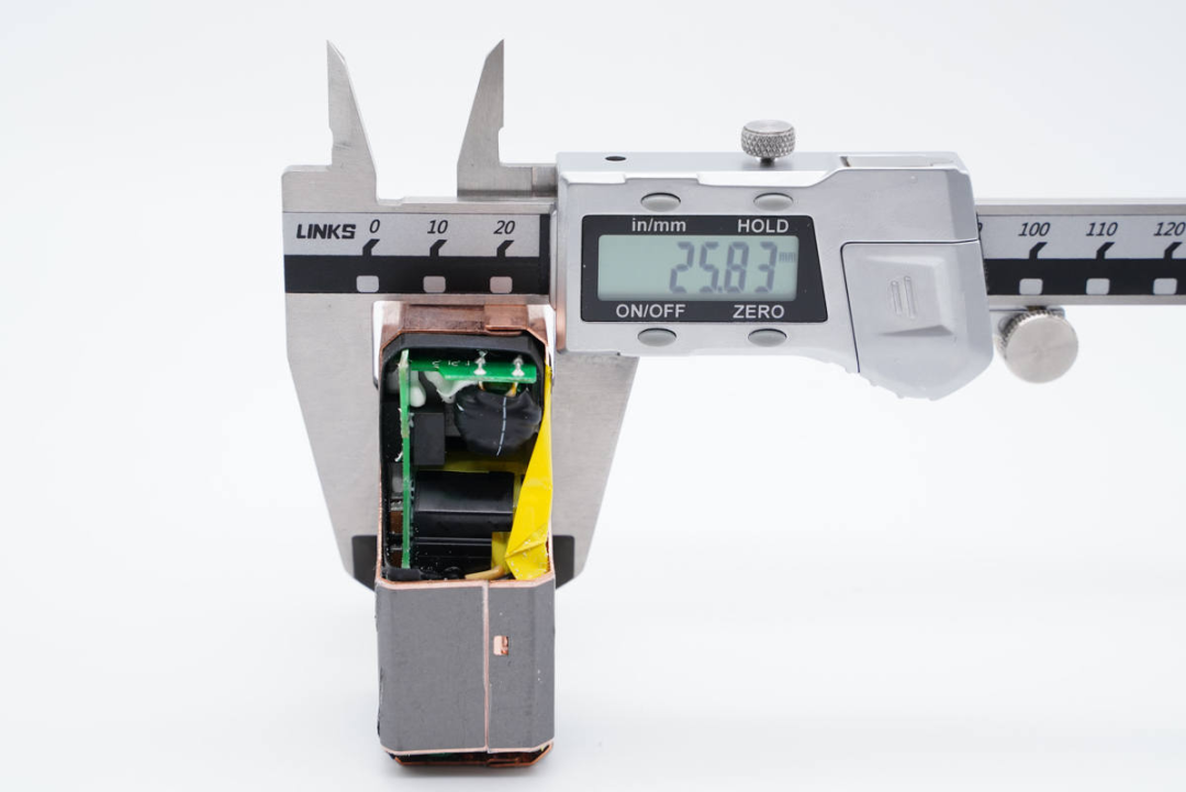 充电头网通过拆解了解到,充电器模块打胶帮助导热,同时外面覆盖纯铜散热片,并在散热片上贴有石墨导热贴纸,层层导热,可见设计之初对产品散热性能非常重视。其次是元器件布局层次清晰,前中后均设有小板,内部空间利用率高。