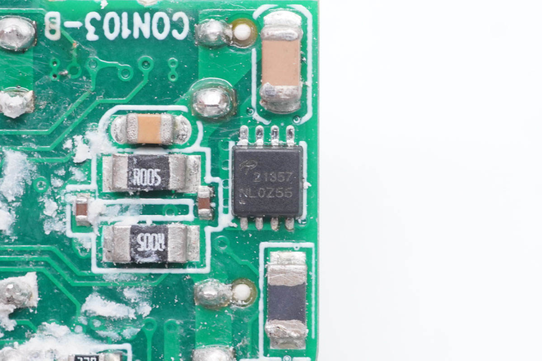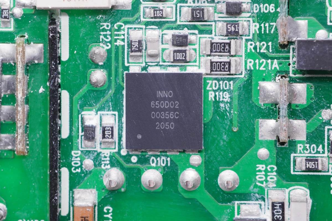 进一步拆解发现,充电器PFC电路采用昂宝OB6566搭配东微的MOS管组成。开关电源电路由安森美NCP1342搭配英诺赛科INN650D02氮化镓功率芯片,以及东科高性能同步整流芯片DK5V100R05M组成。输出端两个C口均采用的昂宝OB2613协议芯片控制输出电压,不过C1口可调电压,C2口额外配置南芯SC8703同步升降压电路进行二次升降压输出。